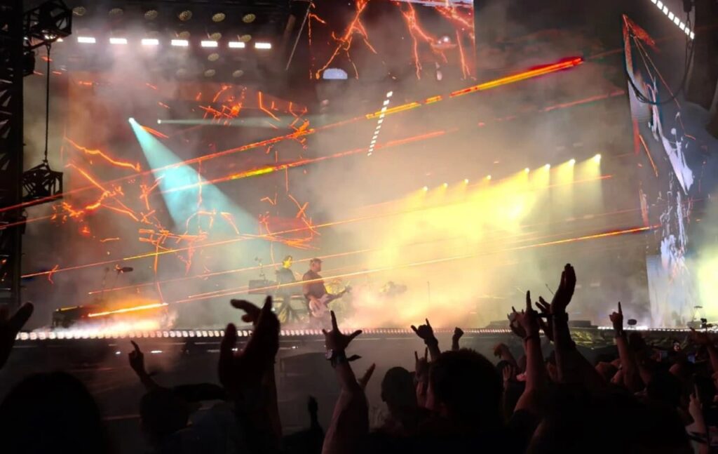 Saat encore dimulai, “Bleed It Out” menjadi lagu pamungkas yang mengakhiri malam dengan ledakan energi. Emily berdiri di atas drum Collin Britain, mengangkat tangan kanan ke udara sebagai simbol era baru Linkin Park. Mike Shinoda, di sisi lain panggung, membagikan pick gitar kepada para penggemar yang berdesakan di barisan depan. Momen itu seperti sebuah pernyataan: mereka masih di sini, masih eksis, dan masih memiliki api untuk menyala lebih lama.